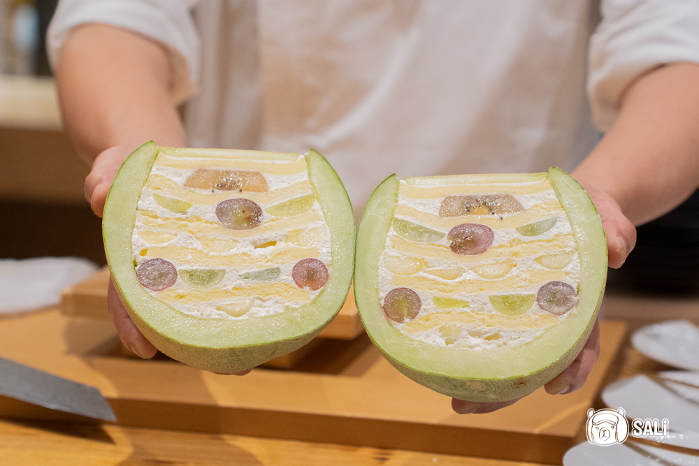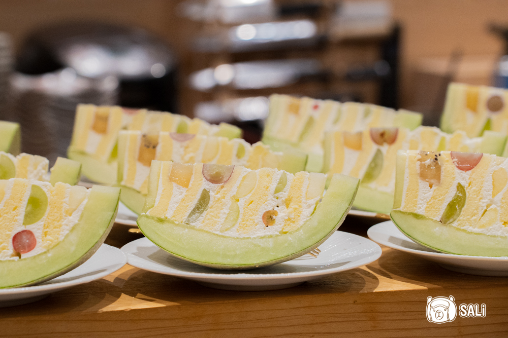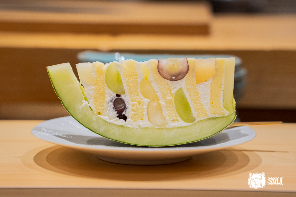 最後登場的是哈密瓜蛋糕,外層以多汁甜香的哈密瓜包覆,內層是柔軟蛋糕與新鮮水果餡,整體口感輕盈、酸甜平衡。水果組合包含哈密瓜、葡萄、綠葡萄與奇異果,每一口都有自然果香與層次變化,甜度清爽,柔軟與果香在口中慢慢散開,為整套餐點劃下完美句點